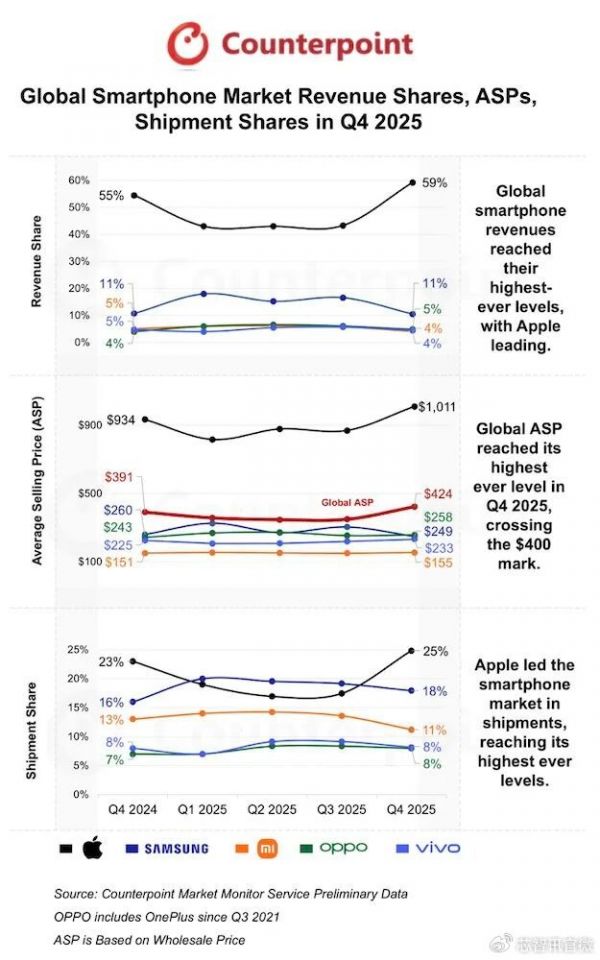 Counterpoint Research 资深分析师Shilpi Jain 指出,2025 年第四季智能手机市场同时受高端机型提前推出、部分地区价格调整,以及年终促销与分期、旧机换新方案影响,带动整体营收与平均售价成长。中端市场在促销活动与部分新兴市场购买力改善的支撑下,也对出货量成长有所贡献。