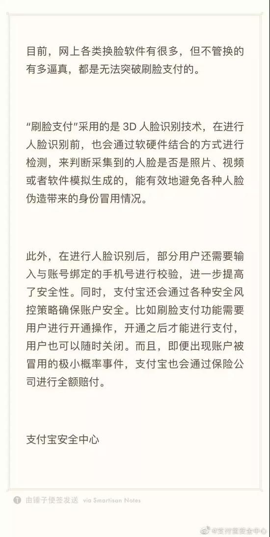 支付宝在之前AI换脸App“ZAO”引发了侵权、隐私安全和信息安全的风险时,回应称:支付宝“刷脸支付”采用的是3D人脸识别技术,各类换脸软件有很多,但不管换的有多逼真,都是无法突破刷脸支付的。