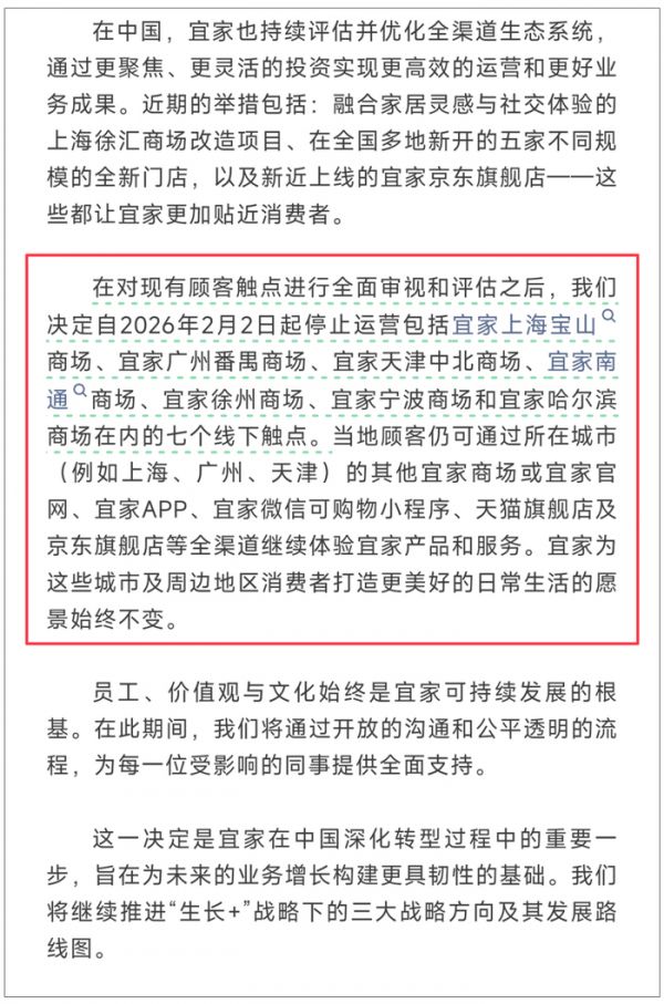 2026年2月2日,宜家正式停止上海宝山、广州番禺、天津中北、南通、徐州、宁波及哈尔滨共7家线下门店的运营。这是自1998年宜家进入中国市场以来,最大规模的一次闭店。