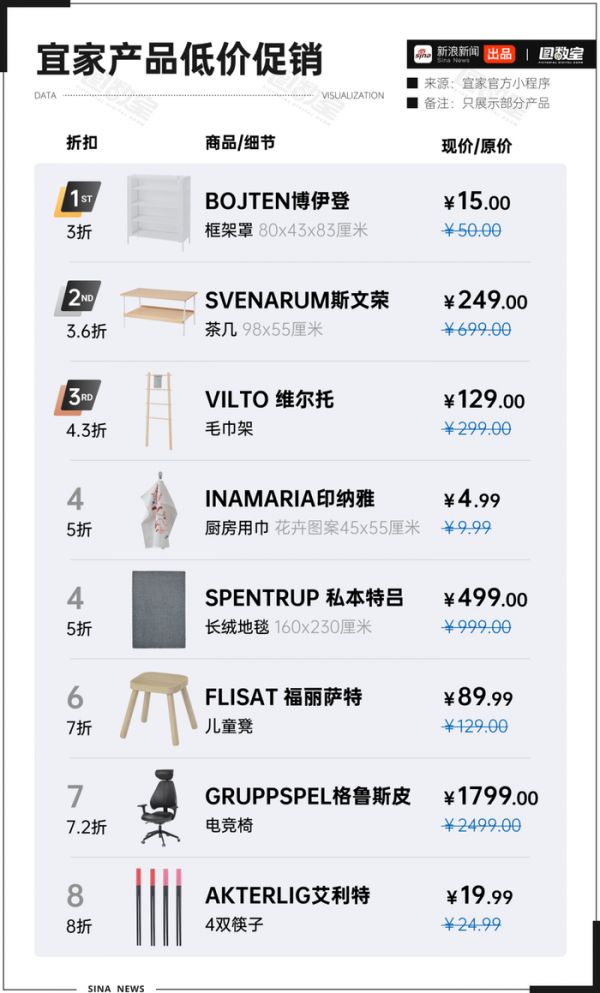 图数室整理了部分在售的折扣产品,发现其折扣力度从3折到8折不等,凸显宜家想用更低的价格,重新吸引顾客稳定市场的决心。