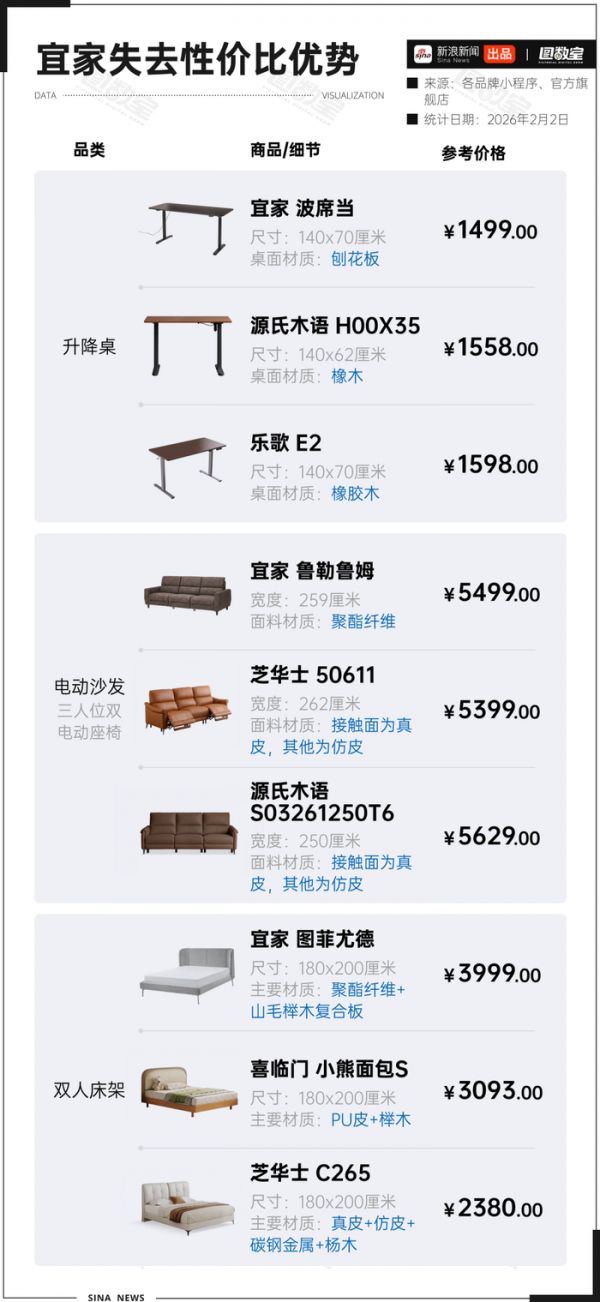 1500元价位的升降桌,国产的源氏木语、乐歌采用实木桌面,宜家用的则是由木屑、木片粘合压制的刨花板;5000元档的电动沙发,国产很多品牌在接触面用真皮,宜家用的却是聚酯纤维,想换真皮还得加2000元;1米8的双人床架,相比国产品牌,宜家也是价高料一般。
