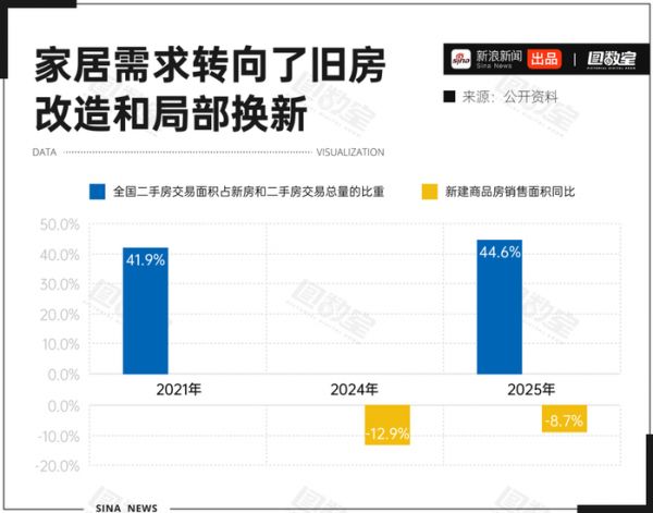 数据显示,国内住房交易重心持续向二手房转移——其占新房与二手房交易总量的比重已从2021年的41.9%进一步提升至2025年的44.6%。与此同时,新建商品房销售面积还在下降。