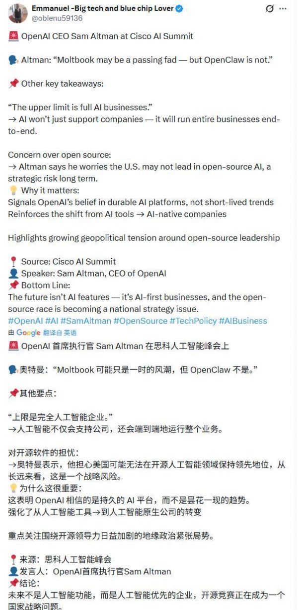 然而,Moltbook的火爆也伴随着风险与争议。奥特曼将现象级产品与底层技术进行了切割:“Moltbook也许只是昙花一现,但OpenClaw不会。”在他看来,Moltbook作为一种具体的社交应用形态可能只是短暂的热潮,但OpenClaw所代表的技术方向,即能自主操作软件、完成复杂任务的智能体,则具有深远而持久的意义。
