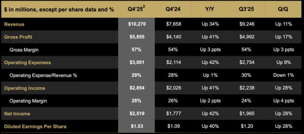 再来看利润,非会计准则下,AMD Q4净利润25.19亿美元,同比大幅增长42%;2025全年,AMD的净利润为68.31亿美元,同比增长26%。