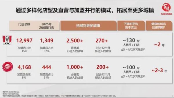 2025 年肯德基的新开门店平均资本支出已经从 2024 年的 150 万元下降至约 130 万元,必胜客则由 120 万元下降至约 100 万元。近两年新推出的多个低成本门店模型已经成为百胜中国拓展低线城市的主力:单店投资 50 万-70 万的肯德基小镇模式;65-85 万的必胜客 WOW;最近正在试点的 70-80 万元的肯德基必胜客 “双子星” 模式。这些低投入的门店模型,主要针对加盟业务,可以帮助百胜中国在偏远地区,战略点位以及低线城市迅速攻城略地。