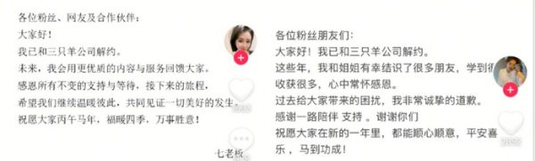 最惨的是,旗下大主播接连解约跑路,前阵子 584 万粉丝的七老板、还有卓士琳先后宣布解约,俩人都取消了抖音主页的三只羊 MCN 认证。