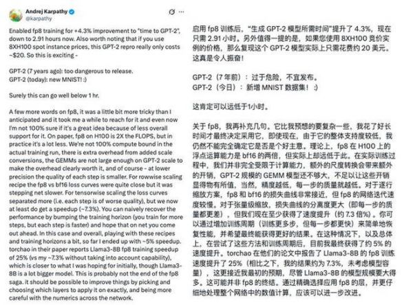 这位OpenAI联合创始人、特斯拉原AI总监、X平台粉丝近200万的KOL,最近发帖称,他只用了2.91小时和20美元的成本,就复现出了七年前的GPT-2模型。