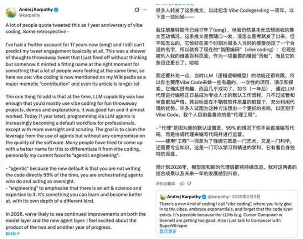 正当人们为vibe coding一年来的战绩兴奋不已时,卡帕西又提到了一个新的概念:agentic engineering。