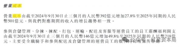 财报显示,2025年第三季度,京东物流参与仓储管理、分拣、拣配、打包、运输、配送及客服等运营员工的员工薪酬福利开支为218亿元,较2024年同期的146亿元增长49.8%,京东物流称主要受全职骑手和参与配送及仓储管理的运营员工的数目同比增加所带动。