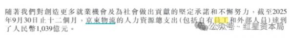 截至2025年9月30日止的十二个月,京东物流的人力资源总支出(包括自有员工和外部人员)达到了人民币1039亿元。