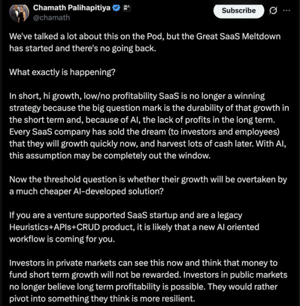 “SaaS 大崩溃已经开始,而且没有回头路了……一种全新的以人工智能为导向的工作流程即将到来……SaaS 大崩溃已经开始。”