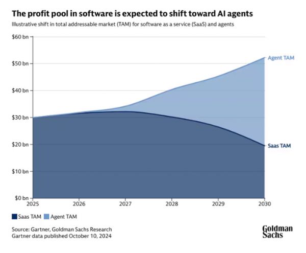 高盛近期的一项研究预测,到本十年末,人工智能代理将显著扩大整个软件市场,并攫取不成比例的利润份额。在他们的框架下,代理不仅仅是增强应用程序的功能,它们本身就成为了工作界面。到 2030 年,超过 60% 的软件经济效益可能会通过 Agent 系统而非传统的 SaaS 服务实现。