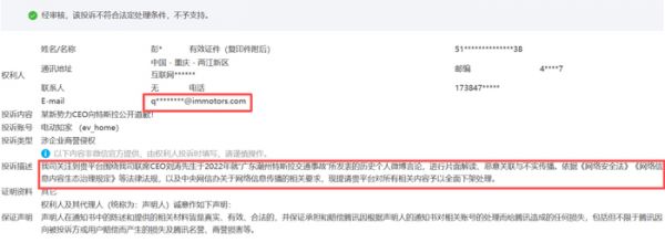再看看我们惹上的麻烦。我们于2月5日下午13:53发出的报道,然后下午15:35我们后台就接到了一彭姓人员的投诉消息,从邮箱的后缀来看应该是智己汽车的官方邮箱,也就是代表这智己汽车的官方投诉。看看投诉的类型是“涉企业商誉侵权”,再看看他们投诉的理由有多么的可笑!