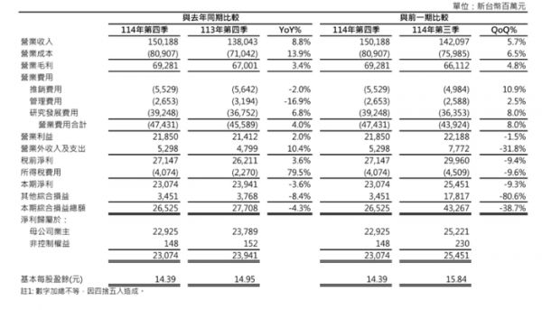 2月4日,联发科公布2025年第四季度及全年合并财务报告。报告指出,第四季度合并营收为新台币1,501.88亿元,较前季增加5.7%,较去年同期增加8.8% ;合并毛利率为46.1%,较前季减少0.4个百分点,较去年同期减少2.4个百分点;合并营业利益为新台币218亿5仟万元,较前季减少1.5%,较去年同期增加2.0%;合并本期净利为新台币230.74亿元,较前季减少 9.3%,较去年同期减少 3.6%。