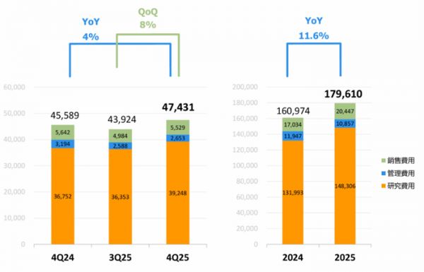 2025年全年联发科营业费用为新台币1,796.1亿元 (占营业收入30.1%),较前一年增加11.6%。
