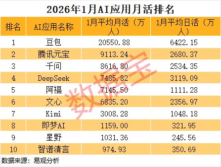 目前来看,阿里千问、字节豆包、腾讯元宝已经形成三足鼎立之势。易观数据显示,1月底豆包以超过2亿的平均月活位居AI应用排行榜首位;腾讯元宝以9113万的平均月活位居次席;阿里千问以8616.8万的平均月活位居第三位。