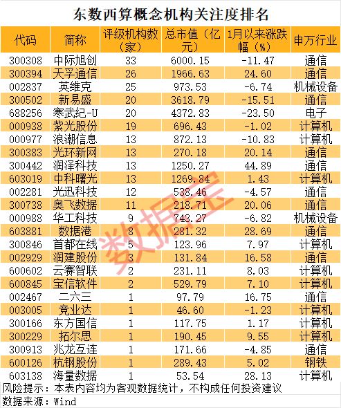 据证券时报·数据宝统计,A股市场上有25只东数西算概念股得到了机构评级。其中,中际旭创、天孚通信、英维克等个股均有20家以上机构评级。机构关注度较高的个股主要集中在CPO、液冷、AI算力、服务器、AIDC等领域。