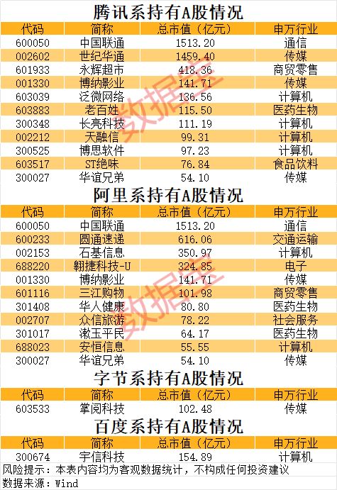 在A股市场上,11家公司前十大流通股东有“腾讯”这一关键词,其中大部分公司股东为林芝腾讯。从市值角度来看,中国联通、世纪华通等公司市值均超千亿元。