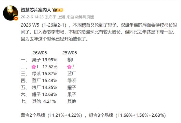 经常关注周数据的朋友或许已经发现了,W5周环比W4周可以用巨变来形容。因为国内主流六大品牌的位置全部发生了变化,但主要的变化其实非常好总结。那就是第一与第二互换,第三与第四互换,第五与第六互换。针对这一周的表现行业人士表示:本周榜首又轮到了果子。双雄争霸的局面会持续很长时间了。进入春节季市场,本周的总量环比有较大增长,但同比去年还是下降一些。因为去年这个时候已经开始放假了。换言这从W5周开始市场总量应该是一周比一周高,一直延续到春节结束。