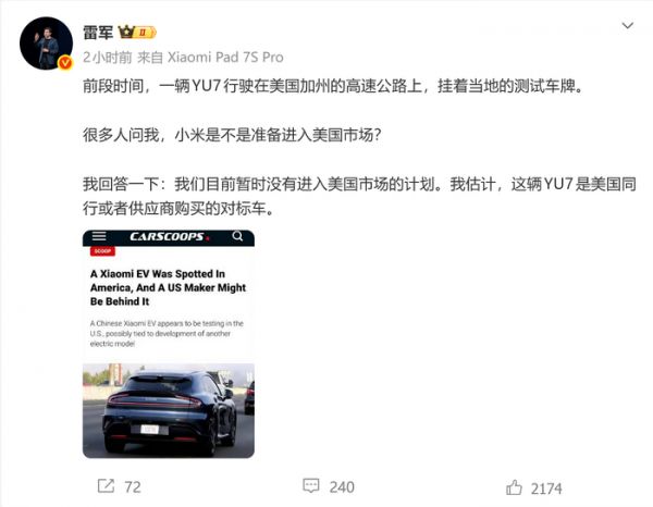 雷军写道,前段时间,一辆YU7行驶在美国加州的高速公路上,挂着当地的测试车牌。很多人问,小米是不是准备进入美国市场?我回答一下:我们目前暂时没有进入美国市场的计划。