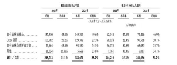 但到了2025年前三季,由于ODM项目收入占比进一步走高,而自有品牌消费品的收入贡献在持续降低,导致虽然收入同比增长11.5%,但毛利却出现了倒车,为2.41亿元,较去年同期的2.442亿元还同比下滑了1.3%。