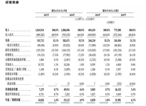 2023年至2024年,公司收入10.149亿元增长至10.861亿元,增幅为7.0%;2024年前三季至2025年前三季,公司收入从6.941亿元增长至7.736亿元,增幅为11.5%。
