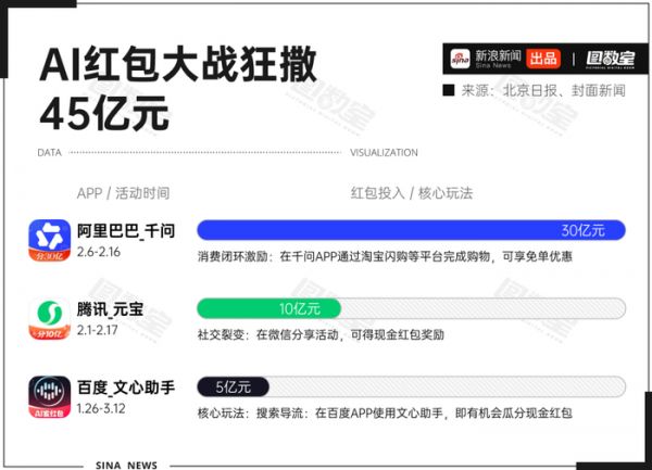 又是一年春节,又是一年“红包大战”,与往年不同,今年AI应用成了这场战役的主角。腾讯、百度、阿里、字节,携着各家AI产品,狂砸超45亿元真金白银,在这场用户争夺的战局中激战正酣。