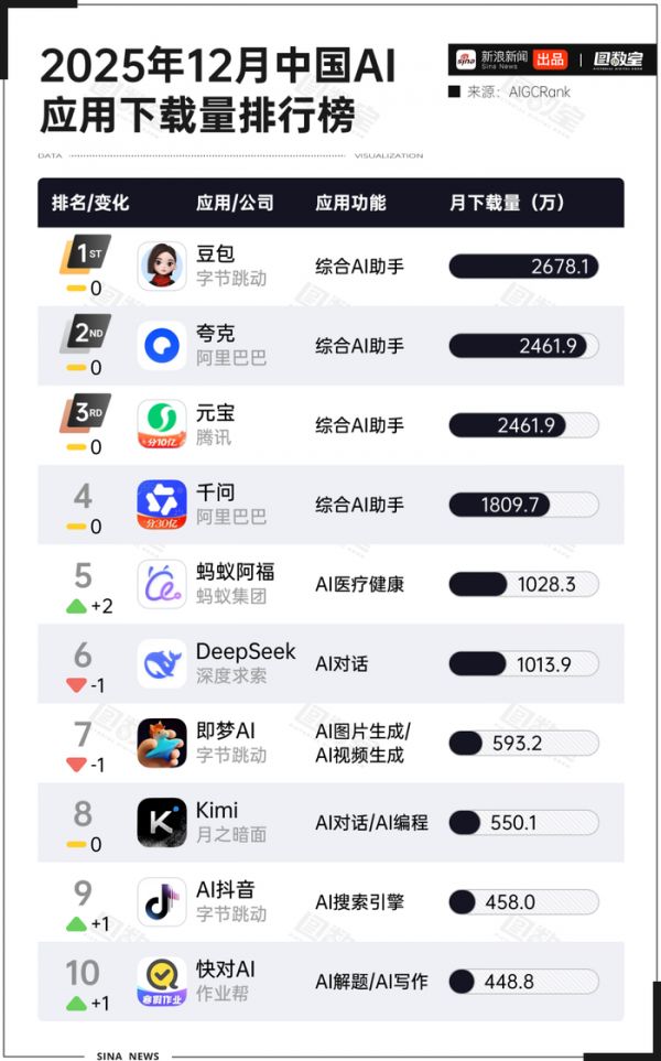 纵览2025年12月的中国AI应用下载榜,我们可以清晰勾勒出一个头部集中的市场格局:字节豆包、阿里夸克、腾讯元宝和阿里千问四大综合助手,以均超1800万次的下载量构成了稳固的第一阵营。