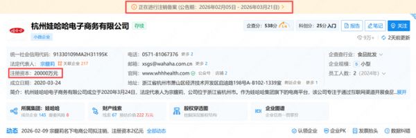 据企查查信息显示,原注册资本高达 2 亿 的杭州娃哈哈电子商务有限公司,已发布注销备案公告,原因是“股东决议解散”。