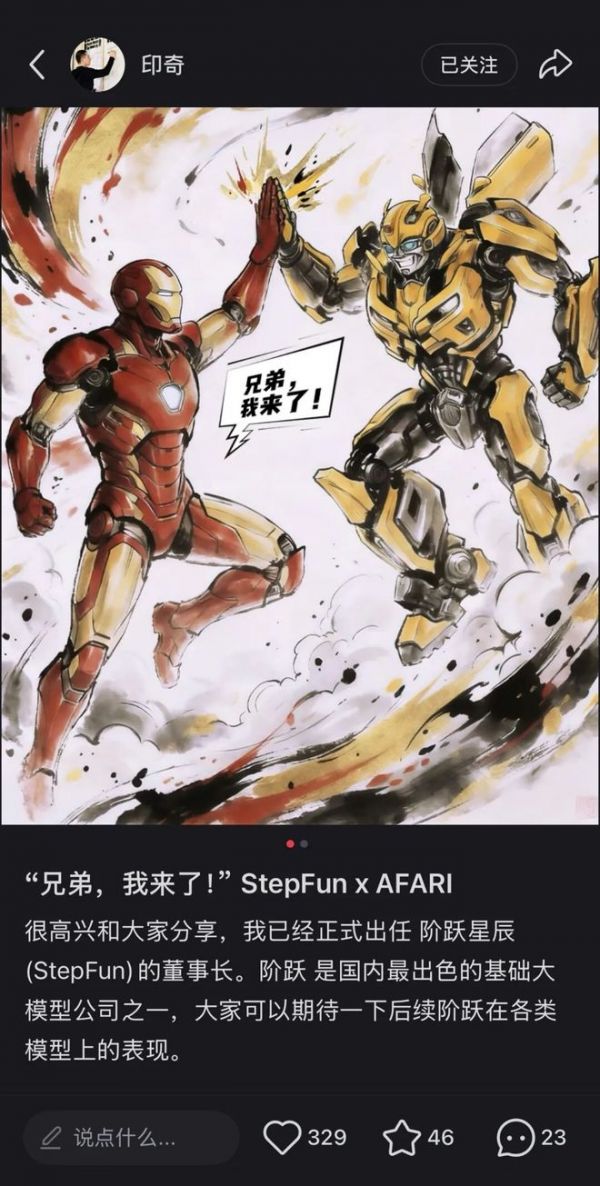 任职阶跃星辰董事长当天,印奇还在自己的小红书账号上发了贾维斯和大黄峰的图片,意指给机器注入AI灵魂。