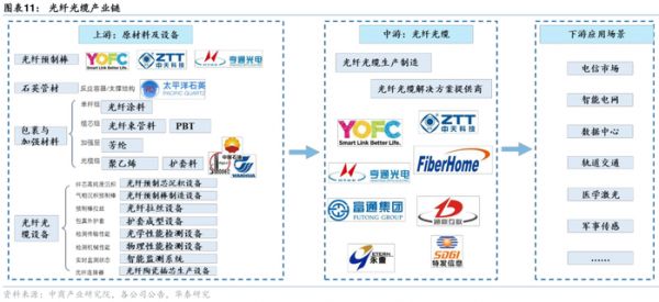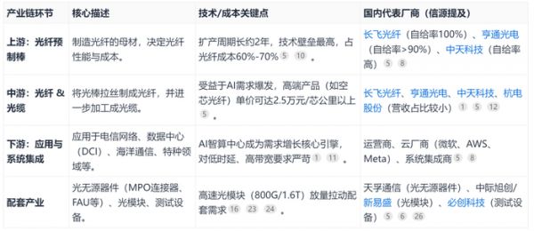 光纤产业链自上而下主要包括光纤预制棒(光棒)、光纤、光缆及下游应用。其中,光纤预制棒是技术壁垒最高、成本占比最大,约60%-70%的核心环节。