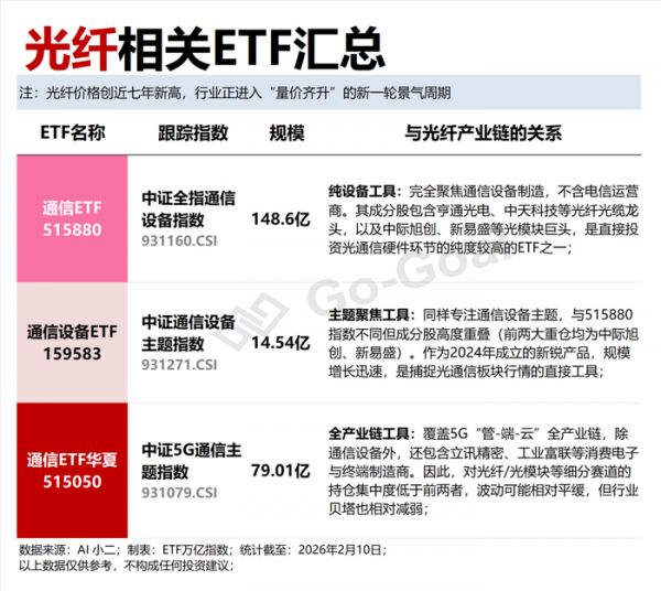 投资者可通过布局通信ETF(515880)、通信设备ETF(159583)、通信ETF华夏(515050),间接投资光纤光缆产业链的核心上市公司。