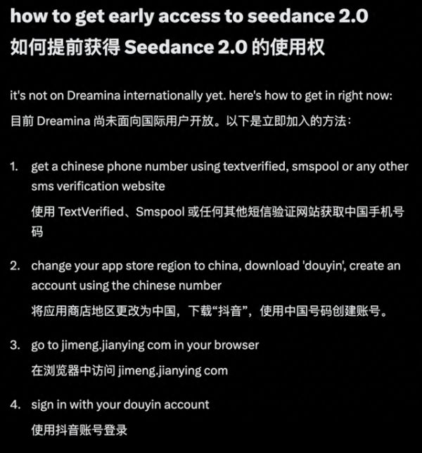 由于Seedance 2.0并未对海外用户开放,X(推特)等国外社交媒体上出现了大量的“引渡教程”,比如教人如何获取中国电话号码并注册抖音账号。