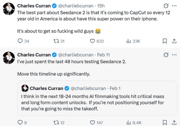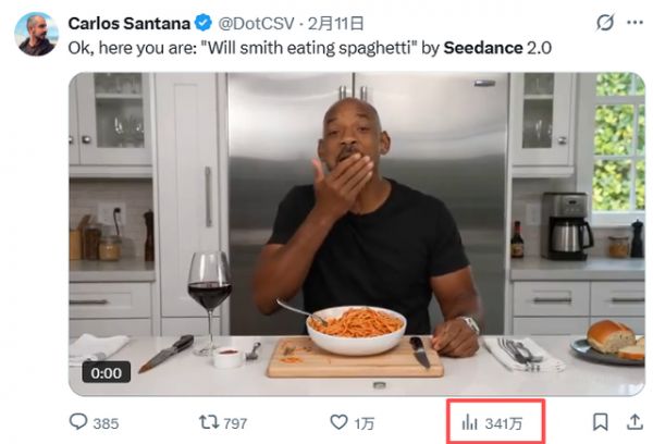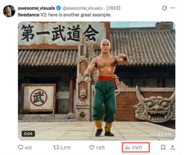 Seedance 2.0制作的视频在X上轻松获得了百万次的浏览
