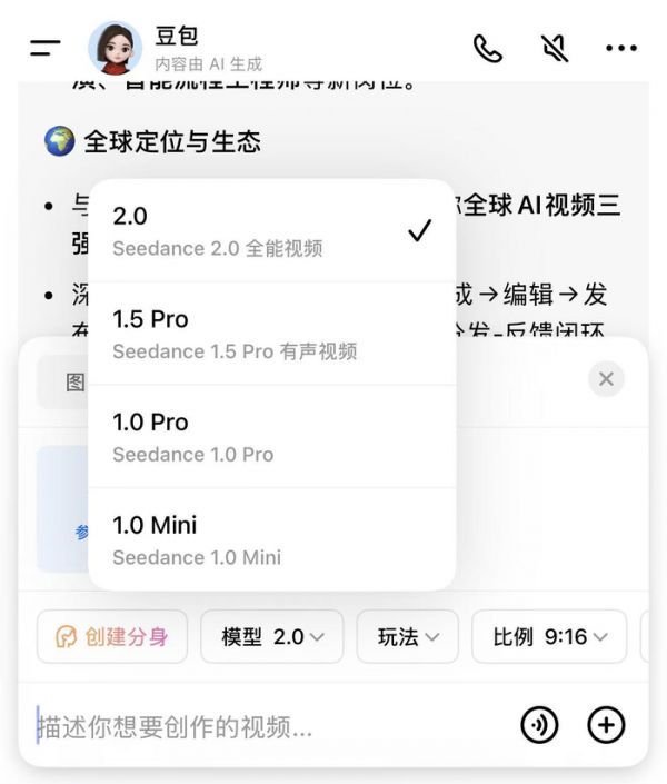 2、豆包 App 对话框-Seedance2.0-选择 2.0 模型;