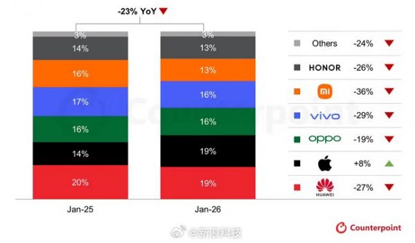 【Counterpoint:#1月中国智能手机市场仅苹果增长#】市场调研机构 Counterpoint Research 今天发布最新报告称,2026 年 1 月中国智能手机市场销量同比下滑 23%。国产品牌普遍出现两位数下跌,原因在于 2025 年初国补政策带来的高基数,以及农历新年时间错位导致的需求节奏变化。