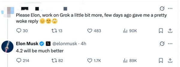 有网友在下方评论称“求你了Elon,好好搞一下Grok吧。”马斯克回复道:“4.2会更好。”