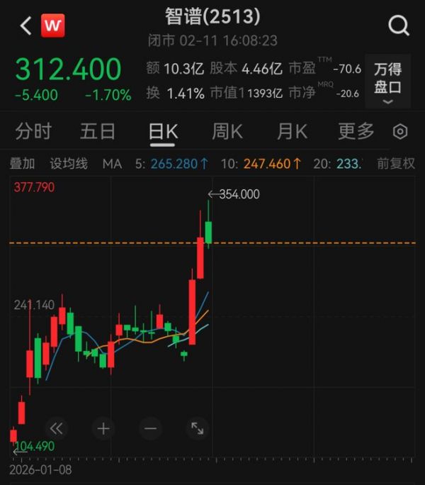 2月9日—2月10日,智谱股价连续暴涨。2月11日,智谱股价下跌1.7%,以312.4港元/股报收,最新市值为1393亿港元。