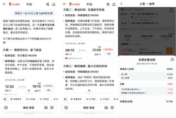 壹览商业拿机票场景为例测试,比如订后天上海飞厦门、北京飞迪拜的机票,千问推荐的东航、南航航班中,都标了“千问专享价”,优惠从几十元到几百元不等。刻意去比多平台比了价,确实最低。
