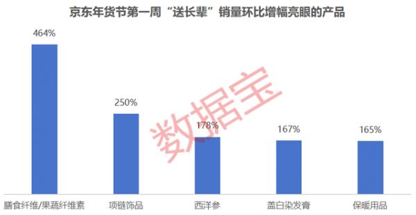 纵向来看,从“送长辈”年货销量变动来看,多款产品在年货节期间销量增幅亮眼。环比增幅位居首位的是膳食纤维/果蔬纤维素,环比增幅高达464%;其次是项链饰品,环比增幅高达250%;另外,保暖用品销量环比增幅也高达165%。
