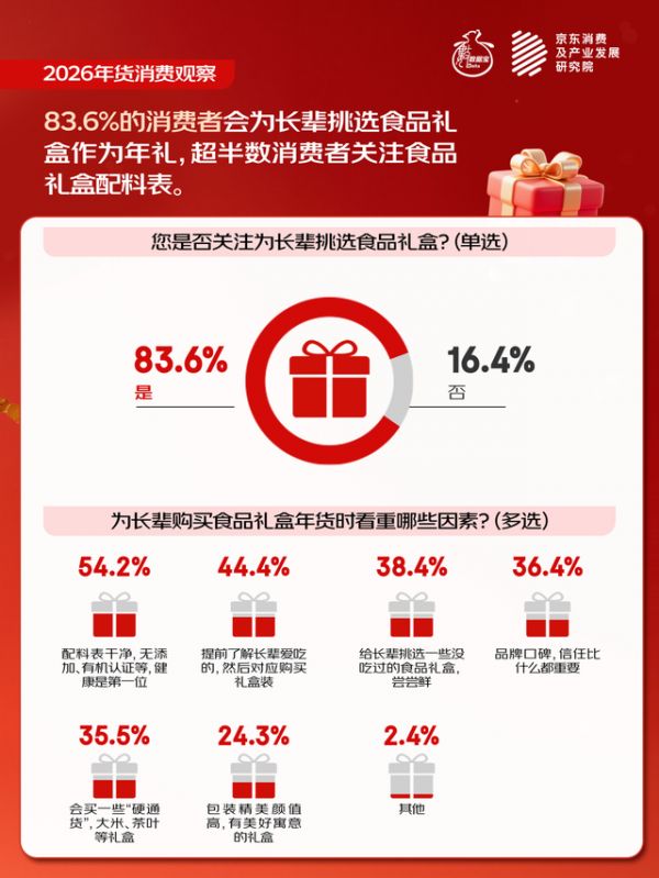 四是食品礼盒回归健康与情感。调查显示,54.2%的消费者首要关注配料表干净,其次看重长辈口味,得票率44.4%,也希望为长辈尝鲜,让年礼成为情感沟通的新纽带。
