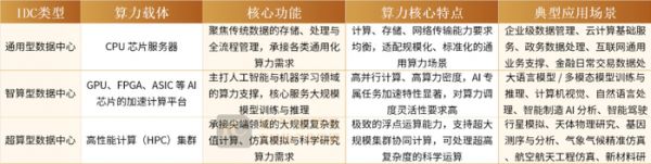 一般而言,IDC 可分为三类:通用型数据中心基于 CPU 芯片服务器提供算力,聚焦传统数据存储、处理与管理,对计算、存储、网络传输能力要求均衡;智算型数据中心依托 GPU、FPGA、ASIC 等 AI 芯片的加速计算平台,主打人工智能与机器学习领域的大规模模型训练;超算型数据中心则由高性能计算集群构成,主要服务于行星模拟、天体物理、基因分析等尖端科学研究。