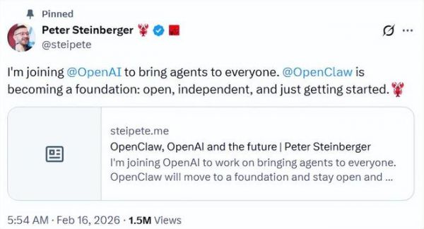 刚刚,OpenClaw 创始人彼得·斯泰因贝格尔(Peter Steinberger)宣布将加入 OpenAI,致力于让所有人都能使用 Agent。