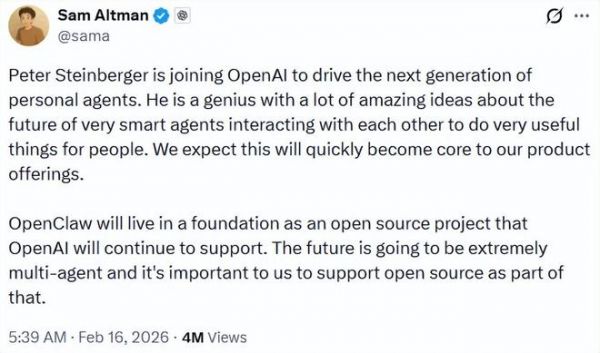但这并不意味着 OpenClaw 项目的终止。基于此次合作,OpenAI 也将继续支持该项目,让 OpenClaw 社区支持更多模型和公司,继续为思想家、技术专家以及所有希望掌控自身数据的人们提供交流平台。
