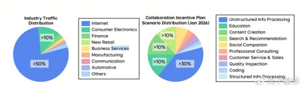 左边的饼状图显示了行业流量分布,互联网占据了主导地位。右边的饼状图显示了企业客户使用场景的分布,其中非结构化信息处理、教育、内容创作和搜索推荐是当前主要需求场景。