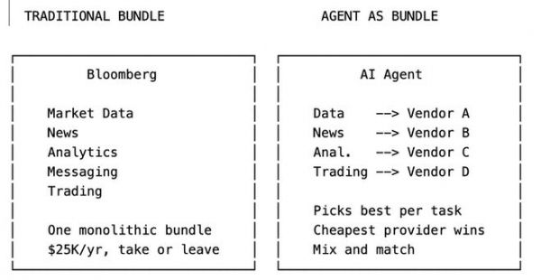 当集成层从软件供应商转移到AI智能体时,购买捆绑包的动力就蒸发了。当智能体可以为每种能力挑选最好(或最便宜)的提供商时,为什么要为整个套件支付彭博的溢价?
