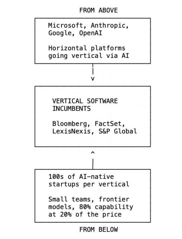 真正的威胁不是LLM本身。它是垂直软件现有巨头没有预见到的钳形攻势(pincer movement)。