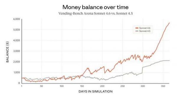 Anthropic声称模型能够在整个上下文中有效推理,并通过Vending-Bench Arena这个基准测试来表现出Sonnet 4.6的有效推理。