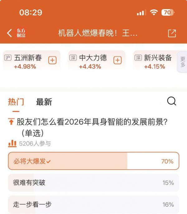 在该社区榜单上,大家热议的也是有关机器人的话题。2026年春晚机器人节目《武BOT》燃爆全场,宇树科技、松延动力等公司借助春晚舞台展示技术实力。社区在该话题下方发起讨论“股友们怎么看2026年具身智能的发展前景(单选)”?在“必将大爆发”“很难有突破”“走一步看一步”三个选项中,超70%股民选择了“必将大爆发”。