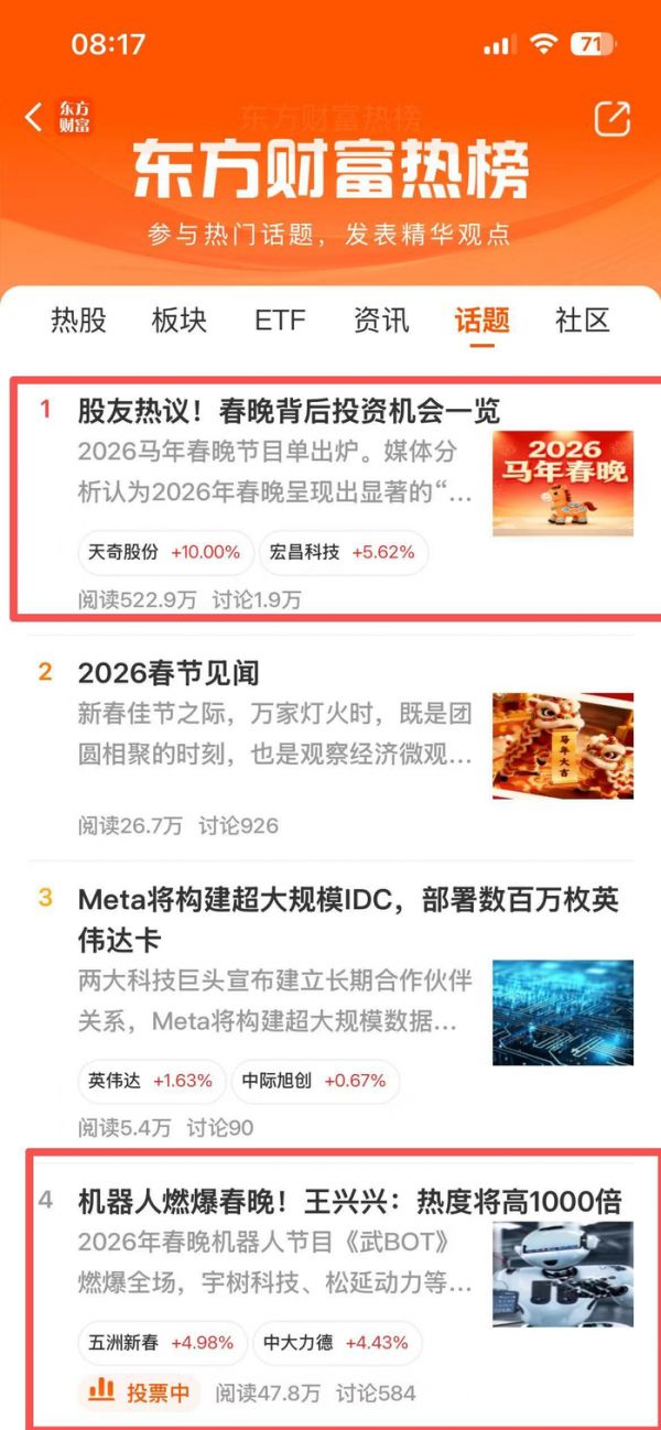 正月初三上午,记者浏览东方财富社区,发现“春晚背后投资机会”仍雄霸榜首,522.9万人阅读,1.9万人参与讨论。媒体分析认为,2026年春晚呈现出显著的“科技感”与“情绪价值”导向,吸引了多家AI与机器人领域企业(如宇树科技、火山引擎、银河通用等)以及潮玩卡牌品牌(名创优品、卡游等)成为合作伙伴,反映了从物质消费向情绪与文化消费转变的趋势。